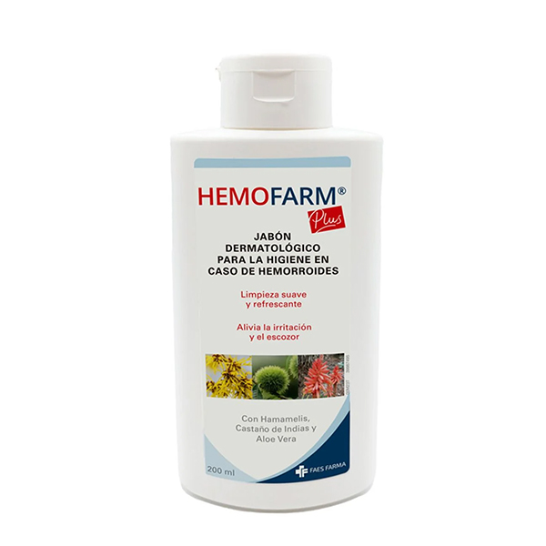 Hemofarm Plus Jabón Dematológico contiene extracto de hamamelis, extracto de castaño de Indias, gel de aloe vera, cloruro de benzalconio y bisabolol.