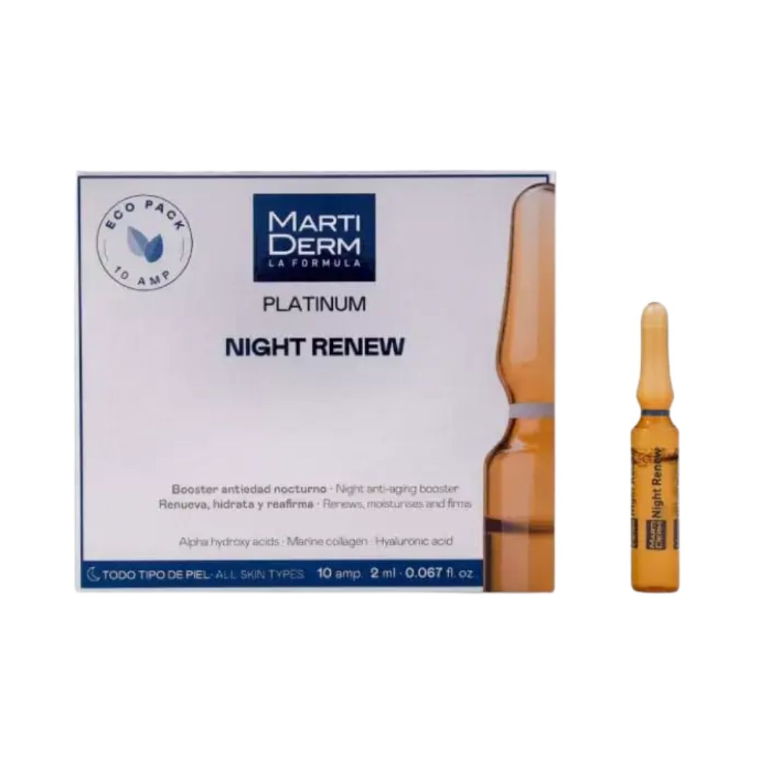 Las ampollas Night Renew, por su contenido en alfa hidroxiácidos, realizan una suave exfoliación de las capas superficiales de la piel. El colágeno marino, junto con el ácido hialurónico, evita la pérdida de agua y estimula la producción de colágeno y elastina, a la vez que hidrata, protege y da estructura a la piel.