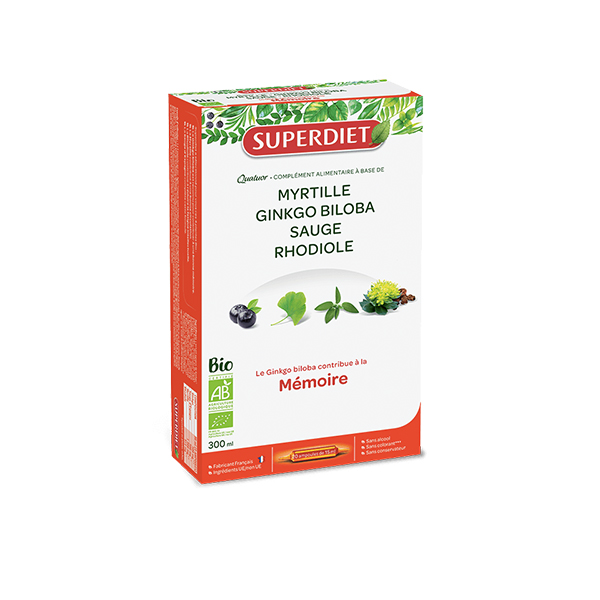 Composición Extracto acuoso de Ginkgo* (hoja) y salvia española* (hoja y tallo), zumo concentrado de vid roja* (fruta), zumo concentrado de arándano* (fruto), extracto de rodiola* (raíz).*Ingrediente procedente de la agricultura biológica.