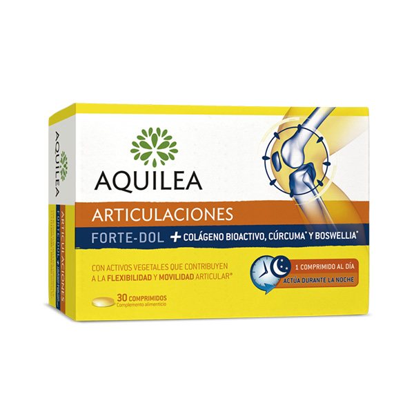 Colágeno bioactivo tipo II, que es una proteína que se encuentra naturalmente en los cartílagos, huesos y piel. Las proteínas, como el colágeno, contribuyen al mantenimiento de huesos u músculos en condiciones normales. El Colágeno bioactivo tipo II tiene la misma estructura que el colágeno que se encuentra en las articulaciones y el tejido conectivo de los cartílagos. La Boswellia y la Cúrcuma ayuda a mantener la flexibilidad y el bienestar de las articulaciones así como a mantener una buena movilidad. El Ácido Hialurónico un componente esencial que se encuentra de manera natural en las articulaciones y cartílagos. El extracto de Pimienta Negra que mejora la absorción de las plantas para una acción sinérgica. Y la Vitamina C que contribuye a la normal formación de colágeno para el funcionamiento normal del cartílago, los huesos y la piel. Aquilea Articulaciones Forte-Dol comprimidos actúa liberando sus ingredientes de manera prolongada a lo largo de la noche y su efecto se nota especialmente por la mañana.
