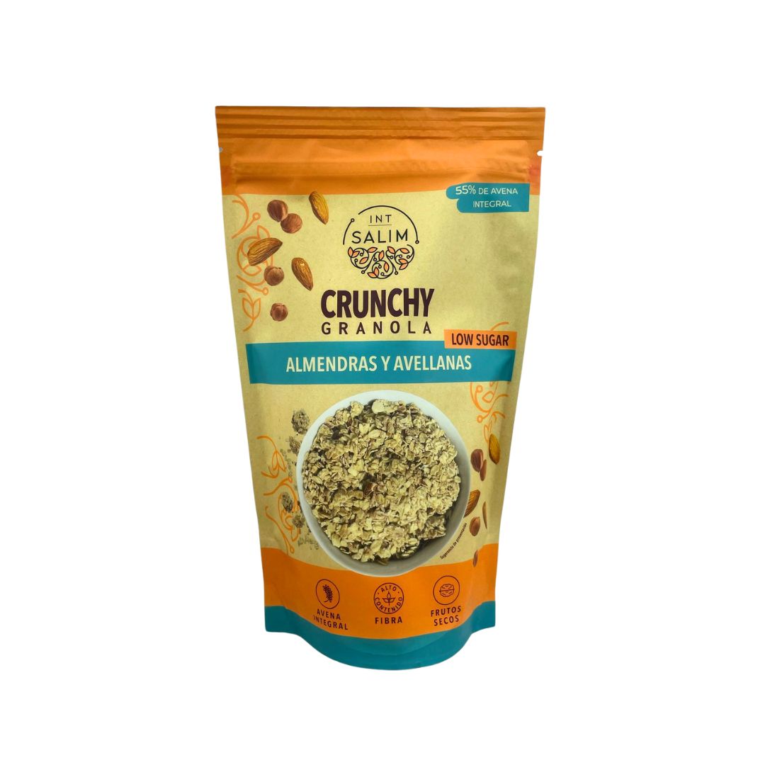 Crunchy Granola con Frutos Secos de Int Salim es una combinación nutritiva y crujiente de cereales integrales, frutos secos y pasas, perfecta para un desayuno equilibrado y energético. Con un 41% de copos de avena integral y copos de trigo, aporta fibra y carbohidratos complejos para una energía sostenida. Las pasas y el coco deshidratado suman un toque dulce natural, mientras que las avellanas tostadas y el germen de trigo enriquecen la mezcla con proteínas y grasas saludables. Endulzada con miel y azúcar integral de caña, su textura crujiente la hace ideal para disfrutar con yogur, bebidas vegetales o como snack saludable.