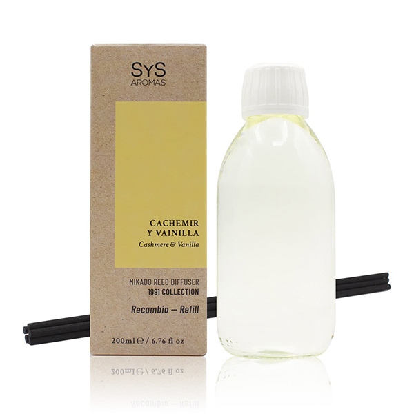 Nuestro Recambio Mikado Cachemir y Vainilla 200ml de la Colección 1991 de SYS Aromas combina la suavidad envolvente del cachemir con la dulzura cálida de la vainilla para llenar cualquier estancia de armonía y confort. Este ambientador mikado convierte tu hogar en un espacio acogedor y lleno de bienestar.