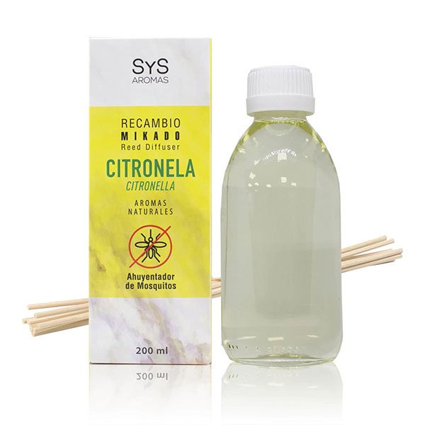 El Recambio Ambientador Mikado Citronela SYS destaca por su suave y delicada fragancia floral combinada con una salida cítrica y fondo almizclado. Este recambio de ambientador Mikado SYS de la Colección Mármol, tiene 200ml y dura más de 4 semanas. Además de la fragancia, incluye un juego de varillas para poder sustituir a las anteriores. Este recambio es una excelente opción para gastar menos y además contribuir con la sostenibilidad medioambiental. El recambio Mikado citronela ayuda a evitar mosquitos y a mantener un aroma cítrico en el hogar. La fragancia Citronela, se ha creado al unir las esencias de la flor del naranjo, cítrico y fondo almizclado. Esta planta forman una combinación única y crean un aroma muy intenso a limón que concentra el toque cítrico. En aromaterapia, el aroma de Citronela destaca por producir una agradable sensación de bienestar cuerpo/mente. Reduce los niveles de estrés y ayuda a aumentar la capacidad de concentración. Además, tiene propiedades antibacterianas y antimicrobianas. En cualquier espacio, este aroma crea ambientes que se destacan por su frescura, cítricos libres de insectos. Las hierba de limón, irrumpen en cualquier lugar inundándolo de un aroma fresco, cítrico e intenso.