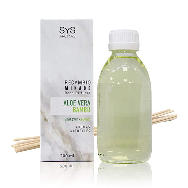 El Ambientador Mikado de Aloe Vera- Bambú SYS destaca por sus notas agrestes y herbales con toques cítricos. Un aroma que aporta relajación y tranquilidad a cualquier espacio. Este recambio de ambientador Mikado SYS de la Colección Mármol, tiene 200ml y dura más de 4 semanas. Además de la fragancia, incluye un juego de varillas para poder sustituir a las anteriores. Este recambio es una excelente opción para gastar menos y además contribuir con la sostenibilidad medioambiental. Aloe Vera-Bambú es una esencia natural muy original y fresca. Combina la frescura del Aloe Vera con el toque herbal y oriental del Bambú. Es una combinación perfecta y sutil de cítricos, hierba verde y flores con notas amaderadas y almizcles. El aroma Aloe Vera – Bambú se caracteriza por sus notas frescas y herbales. En aromaterapia, esta combinación de aromas resulta un gran relajante y tranquilizante, es un aroma renovador de la energía que combate el cansancio y el agotamiento. Puede con cualquier tipo de estrés y es un excelente relajante muscular. En cualquier espacio, este aroma crea un ambiente en casa o en el interior como si estuviéramos al aire libre, incluso en un bosque maravillosos y húmedo. Es una fragancia que llena cualquier ambiente con su aroma fresco y cautivador.