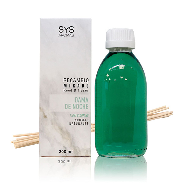 El Recambio Ambientador Mikado de Dama de Noche SYS destaca por sus notas florales, afrutadas y amaderadas con toques exóticos. Un aroma que aporta confort y alivio a cualquier espacio. Este recambio de ambientador Mikado SYS de la Colección Mármol, tiene 200ml y dura más de 4 semanas. Además de la fragancia, incluye un juego de varillas para poder sustituir a las anteriores. Este recambio es una excelente opción para gastar menos y además contribuir con la sostenibilidad medioambiental. El aroma de la Dama de Noche destaca por su elegante combinación de flores, frutas y madera. Es una fragancia delicada, muy exótica y embriagadora, característica de las noches de verano. En aromaterapia, el aroma de la Dama de Noche tiene propiedades curativas tanto física como emocionales. Es un aroma que lleva al confort ya la relajación, y tiene fama de ser relajante y afrodisíaco. En aromaterapia, entre sus beneficios más directos están el alivio de la ansiedad, tensión, depresión, inquietud, irritabilidad, cambios de humor, insomnio y depresión. En cualquier espacio, el aroma de la Dama de Dama de Noche vuelve cualquier espacio confortable y agradable. Rememora los jardines en las noches de verano y aporta un gran equilibrio a cualquier estancia. La presencia de este aroma garantiza la calma y calidez en el hogar y garantiza el descanso y el relax.