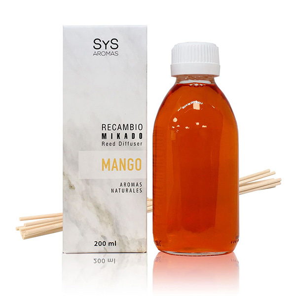 El Recambio Ambientador Mikado de Mango SYS destaca por sus notas tropicales, afrutadas y dulces. Un aroma que aporta energía y alegría en cualquier espacio. Este recambio de ambientador Mikado SYS de la Colección Mármol, tiene 200ml y dura más de 4 semanas. Además de la fragancia, incluye un juego de varillas para poder sustituir a las anteriores. Este recambio es una excelente opción para gastar menos y además contribuir con la sostenibilidad medioambiental. Esta fragancia tropical que se extrae del fruto del mango, contiene todos los atributos del mango maduro, es fresca, dulce y ácida, jugosa, apetitosa, suculenta e informal ya que invita a viajar, a divertirse y a dejarse llevar. Es una fragancia joven e incluso divertida que sin embargo deja una huella intensa y duradera.