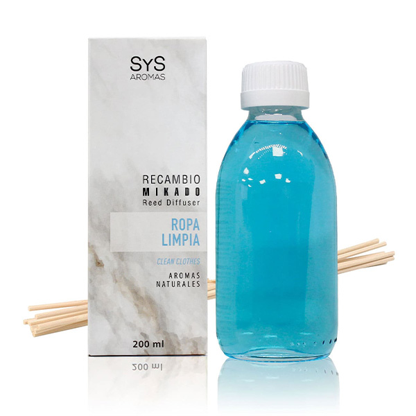 El Recambio Ambientador Mikado de Ropa Limpia SYS destaca por sus notas florales, verdes, amaderadas y afrutadas. Un aroma que aporta frescura y perfume agradable para cualquier olfato. Este recambio de ambientador Mikado SYS de la Colección Mármol, tiene 200ml y dura más de 4 semanas. Además de la fragancia, incluye un juego de varillas para poder sustituir a las anteriores. Este recambio es una excelente opción para gastar menos y además contribuir con la sostenibilidad medioambiental. Esta fragancia es muy amable y tiene la particularidad de que es del agrado de todo el mundo. Resulta muy fresca y familiar, huele a cosas sencillas, a limpio, a fresco, a ropa recién sacada de la lavadora, a hogar y aromas cotidianos que tenemos tan interiorizados y son tan esenciales en nuestra vida, que literalmente, nos hacen sentirnos cómodos y como en casa a través del olfato, por eso a la esencia de Ropa Limpia la llaman “el perfume de la felicidad”, porque olerla nos mete de lleno en nuestra propia vida confortable y cotidiana.