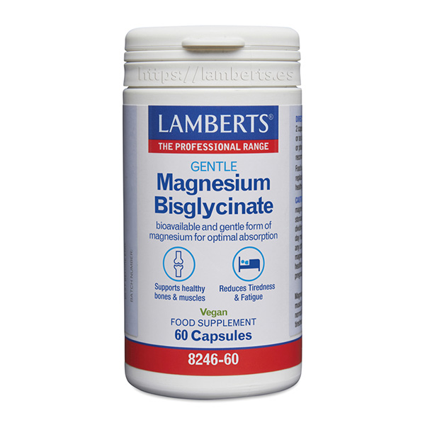 El Magnesio Bisglicinato de Lamberts® proporciona 150 mg de magnesio elemental por cápsula. Esta forma aminoquelada, unida a glicina, es reconocida por su excelente tolerancia, especialmente en personas con sensibilidad intestinal o que deseen evitar posible efecto laxante.