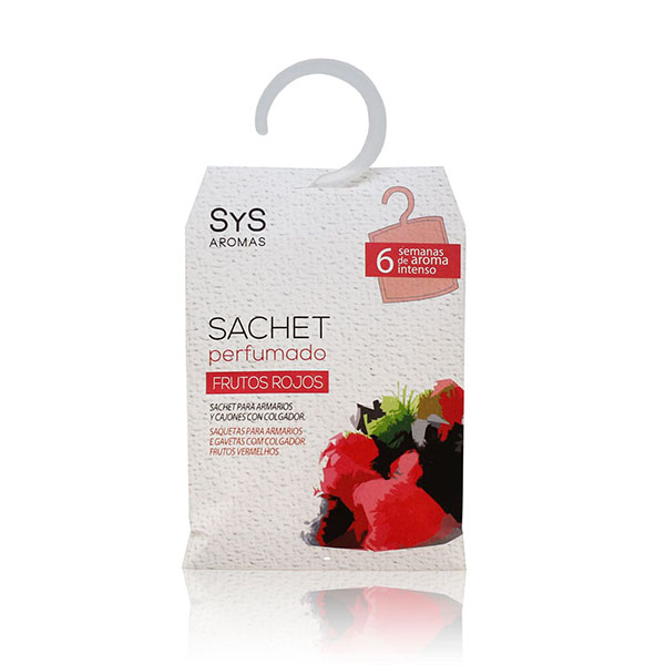 El Sachet perfumado SYS de Frutos Rojos destaca por sus notas afrutadas y dulces con toques de azahar. Un aroma que aporta sensualidad y vitalidad a cualquier espacio. Un Sachet que tiene 12g. y perfuma con intensidad, durante 8 semanas, armarios y cajones. Deja un agradable aroma en tu ropa, ropa de hogar, calzado… Un solo sachet por cajón o armario es suficiente para perfumar todo el espacio. Colocando el sachet cómodamente sobre una barra colgadora o en la esquina del armario o cajón, notarás como todo el espacio y la ropa, calzado o textil del hogar se impregna de tu aroma favorito.