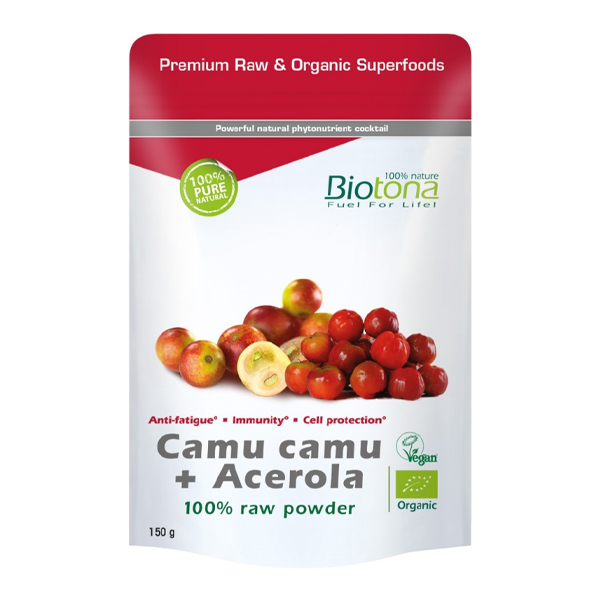 El camu camu es un fruto rojo-púrpura, que crece en arbustos en forma de matorral, pudiendo llegar a 5 m, cubriendo orillas pantanosas en el río Amazonas en América del sur. Numerosos estudios han demostrado que el camu-camu puede contener hasta 2% de vitamina C, Este contenido varía en función del grado de maduración. Biotona Camu camu + Acerola procede de acerola Brasileña y camu camu de Perú 100% biológicos. Después de su cosecha y una rigurosa Salección, las bayas son reducidas a polvo por un procedimiento de liofilización que permite preservar el gusto, el olor y el color de los frutos así como las sustancias y fito-nutrientes presentes de forma natural.